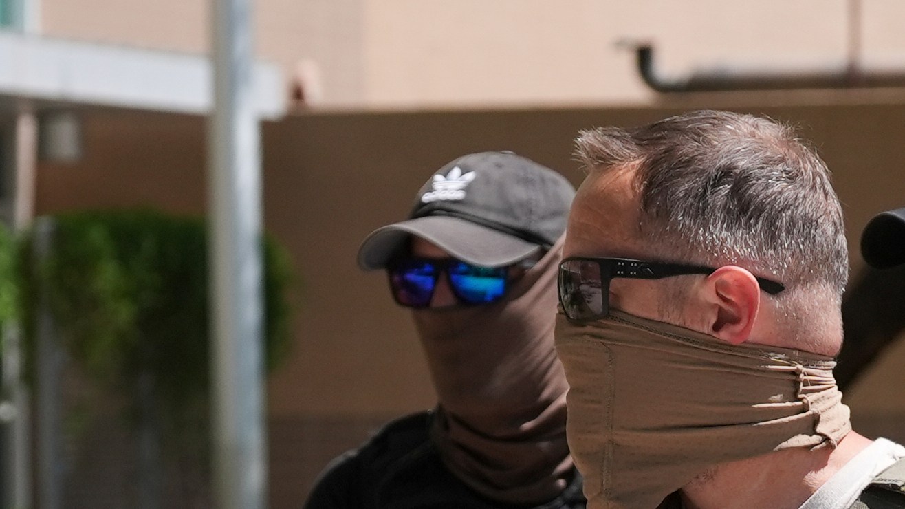 ICE and HSI police walk to an immigration court to take someone into custody, Wednesday, May 21, 2025, in Phoenix. (AP Photo/Ross D. Franklin)