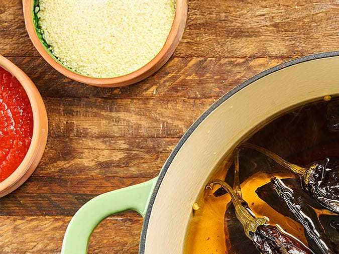 - Boil the chiles (guajillo, California, & chiles de arbol).