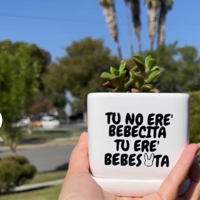 This beautiful white ceramic square pot with Bad Bunny’s “Me Porto Bonito” lyric “No Ere’ Bebecita, Ere’ Bebesota” is the perfect starter pot to build your own plant collection. This pot—styled with a bunny repping el Conejo Malo—is 3.5 inch in diameter and 3 inch in height with its own ceramic tray and drainage hole for excess water. A cute addition to your plant mami journey to add some personality to your potted plants.