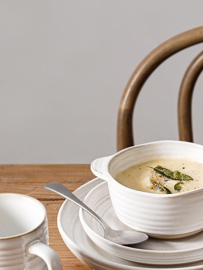 Serve in ceramic soup bowls, which retain heat longer and are oven- and microwave-safe. For a special touch, place a slice of bread topped with cheese under the broiler for a few minutes. Shiny stainless-steel soup spoons complete this simple yet sophisticated presentation.