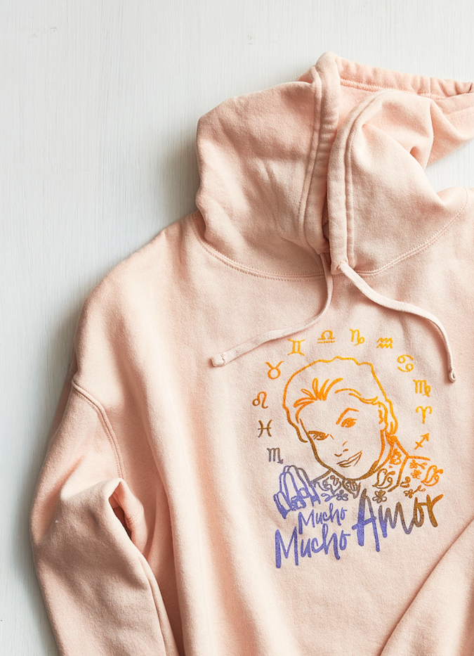 Driven by a love for their culture, the community of artists of Te Lo Juro created their collective to celebrate Latinxs with their fashion and art. Te Lo Juro Collective’s horoscope sweatshirt features all the signs surrounding the beloved astrologer and Puerto Rican icon, Walter Mercado. This nostalgic piece includes Mercado’s signature phrase “mucho mucho amor” and is also laid out across the design to remind us of his voice and positive message. The cropped pullover is just one of many other apparel items featuring the icon, one of which was featured in his Netflix documentary, Mucho Mucho Amor: The Legend of Walter Mercado.