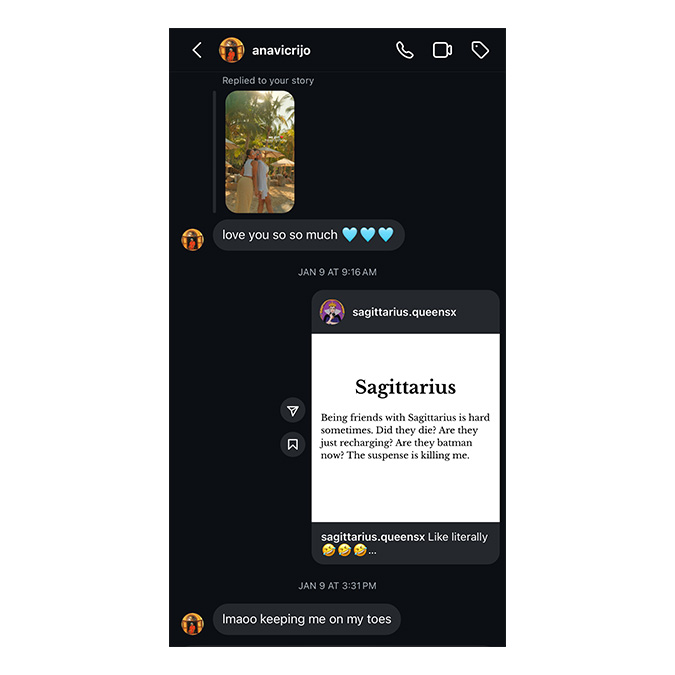 Their digital connection thrives on sharing social media content, says Thatiana. “It’s just memes or quotes—little things we see that remind us of each other. I think it’s even nicer than a text sometimes because it shows that I was thinking of her when I saw that post.”