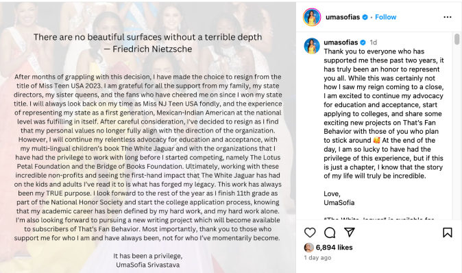 “After months of grappling with this decision, I have made the choice to resign from the title of Miss Teen USA 2023. I am grateful for all the support from my family, my state directors, my sister queens, and the fans who have cheered me on since I won my state title. I will always look back on my time as Miss NJ Teen USA fondly, and the experience of representing my state as a first generation, Mexican-Indian American at the national level was fulfilling in itself,” Srivastava wrote on Instagram. “At the end of the day, I am so lucky to have had the privilege of this experience, but if this is just a chapter, I know that the story of my life will truly be incredible.”