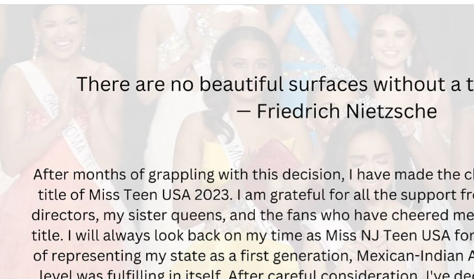 “After months of grappling with this decision, I have made the choice to resign from the title of Miss Teen USA 2023. I am grateful for all the support from my family, my state directors, my sister queens, and the fans who have cheered me on since I won my state title. I will always look back on my time as Miss NJ Teen USA fondly, and the experience of representing my state as a first generation, Mexican-Indian American at the national level was fulfilling in itself,” Srivastava wrote on Instagram. “At the end of the day, I am so lucky to have had the privilege of this experience, but if this is just a chapter, I know that the story of my life will truly be incredible.”