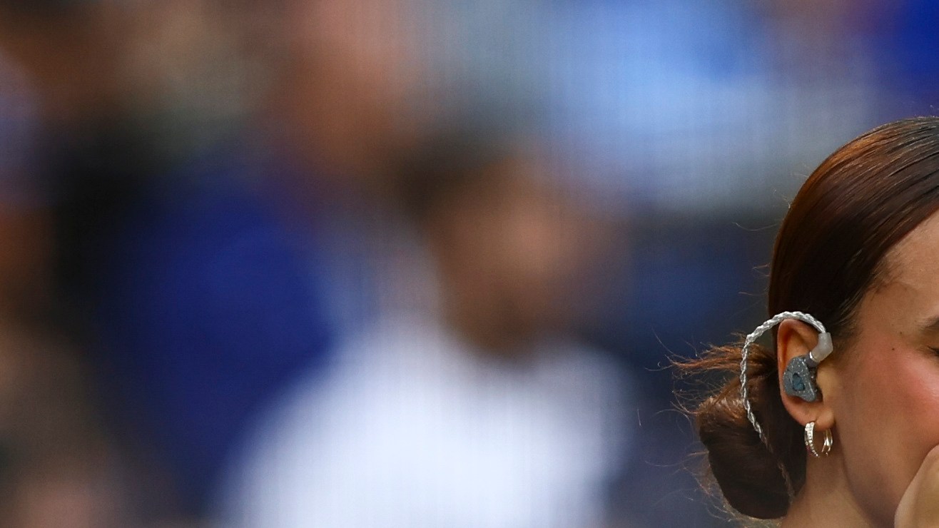 ARCHIVO - La cantante Nezza llora después de interpretar el Himno Nacional de Estados Unidos antes del juego del sábado 14 de junio de 2025, entre los Dodgers de Los Ángeles y los Gigantes de San Francisco (AP Foto/Jessie Alcheh, archivo)