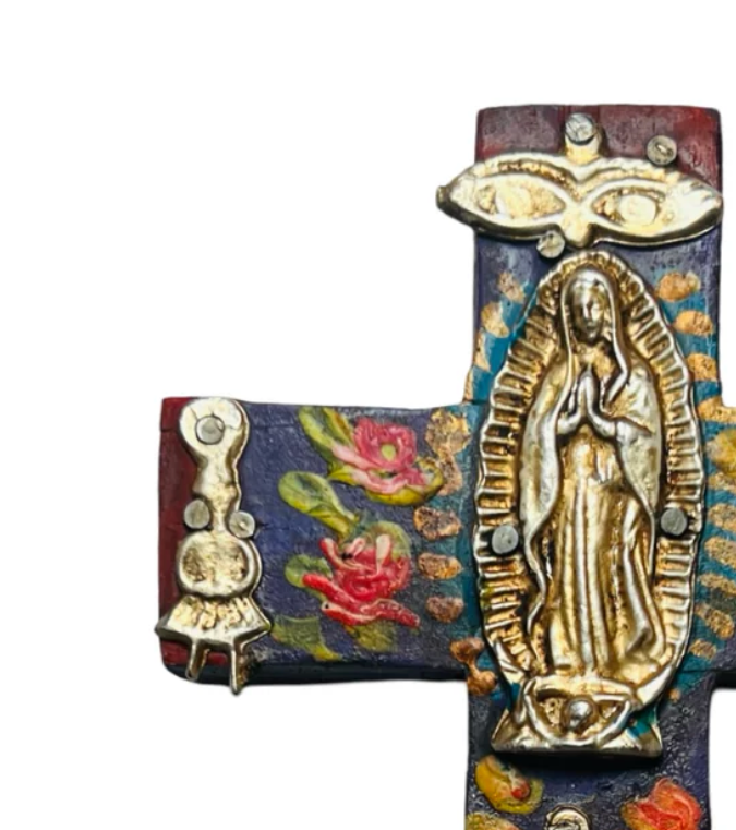 Artelexia Hand Painted Wooden Virgen Cross w/Milagros, $18, available at artelexia.com.
